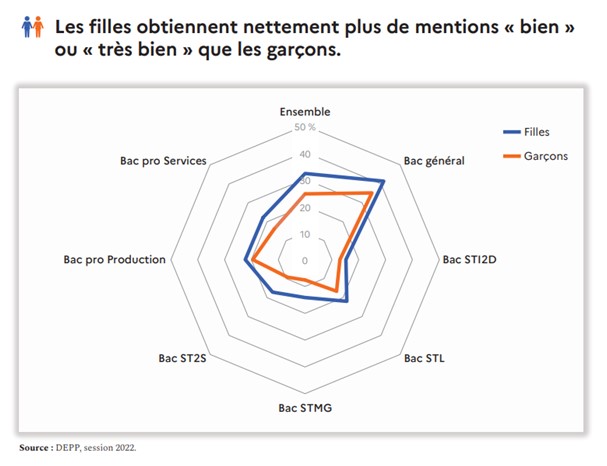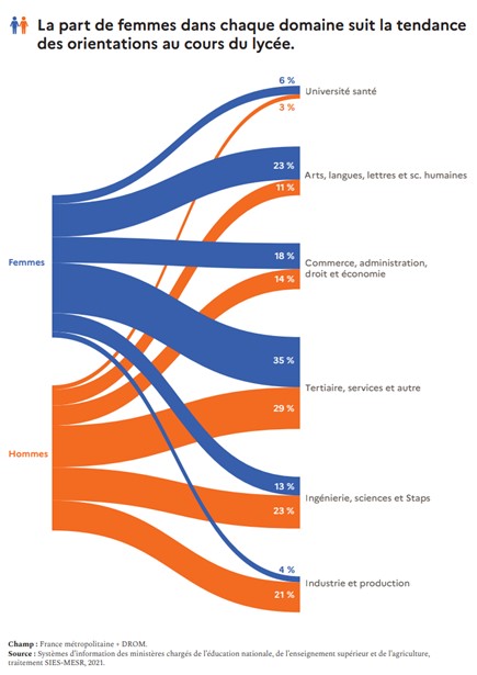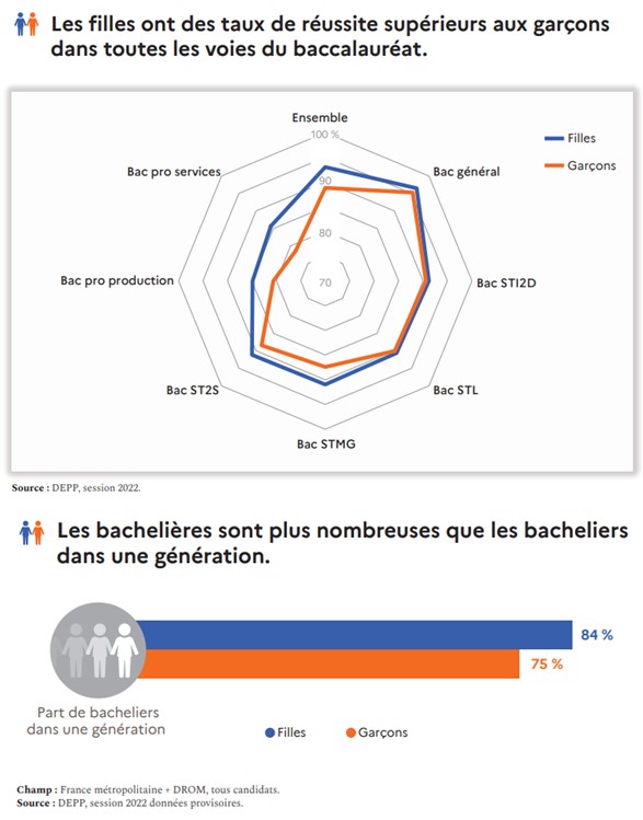 - « En lycée général et technologique, le choix des enseignements de spécialité en 1re générale est éloquent : les garçons ont tendance à moins diversifier leurs choix et à les concentrer sur les disciplines scientifiques tandis que les filles répartissent davantage leurs choix et formulent plus de demandes d’enseignements relevant des sciences humaines ».