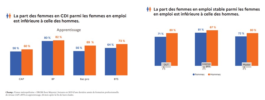 - « Les décisions d’orientation vers la voie professionnelle présentent un écart de 12 points entre les filles et les garçons (31,7 % pour les filles et 43,9 % pour les garçons) ».